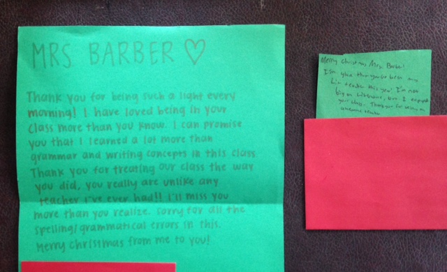Thanks to Abby Coe, an AP Lit student from last year, who wrote a letter for me. I bawled like a baby when I read her letter (the same response I had when I read Jake Peterson’s recommendation five years ago). I told Abby Tuesday night that her letter means more to me than any award I could ever receive, and I’m glad she had a platform to share her story. Thank you, Abby; I’m so proud of you!