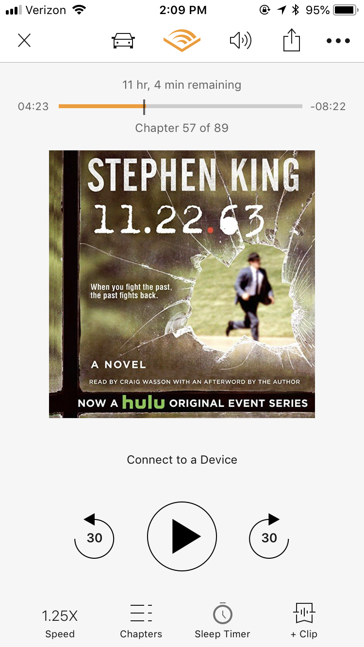 WOW – I finally finished! I have been listening to this through Audible (which was a great reading) since May as I walked the dog and went to the gym, so it took a while to finish. I really enjoyed the story, and of course loved that the main character is a high school English teacher. The story is incredibly believable even though it involved time travel. I think if I had read the book as opposed to listening (which would have enabled me to finish it more quickly), I would have given this 5 stars. If you’re not a Stephen King fan, give this a try as it departs from his normal writing.