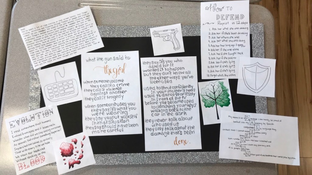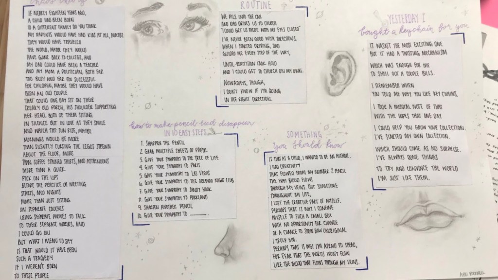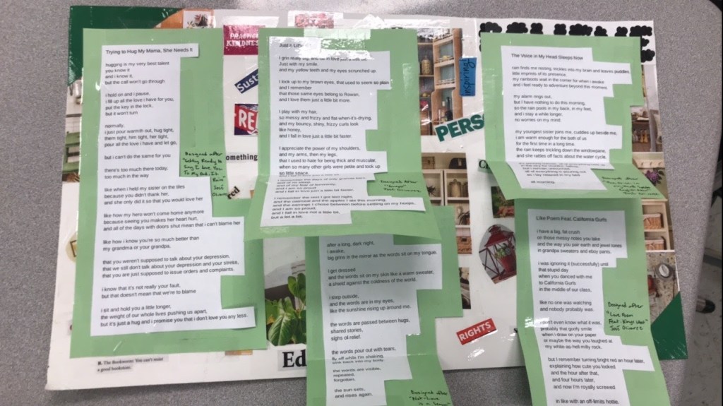 The assignment itself is pretty simple. It is something that I’ve adapted from a Winter Institute assignment that I attended with the Oregon Writing Project a few years ago. Students choose five poems that speak to them in some way and use them as mentor texts to create their own after poems that speak to their identity. They then take the five poems and put them together on a poster along with some visual representations that compliment each poem. I allow some students to do this electronically on a google doc or slide if they are more comfortable with these mediums. The only requirements are five poems that speak to their identity and five images to compliment. Here is the assignment that I give them. It breaks down the assignment with an example of a mentor poem and how I’ve used it to create an after poem.
